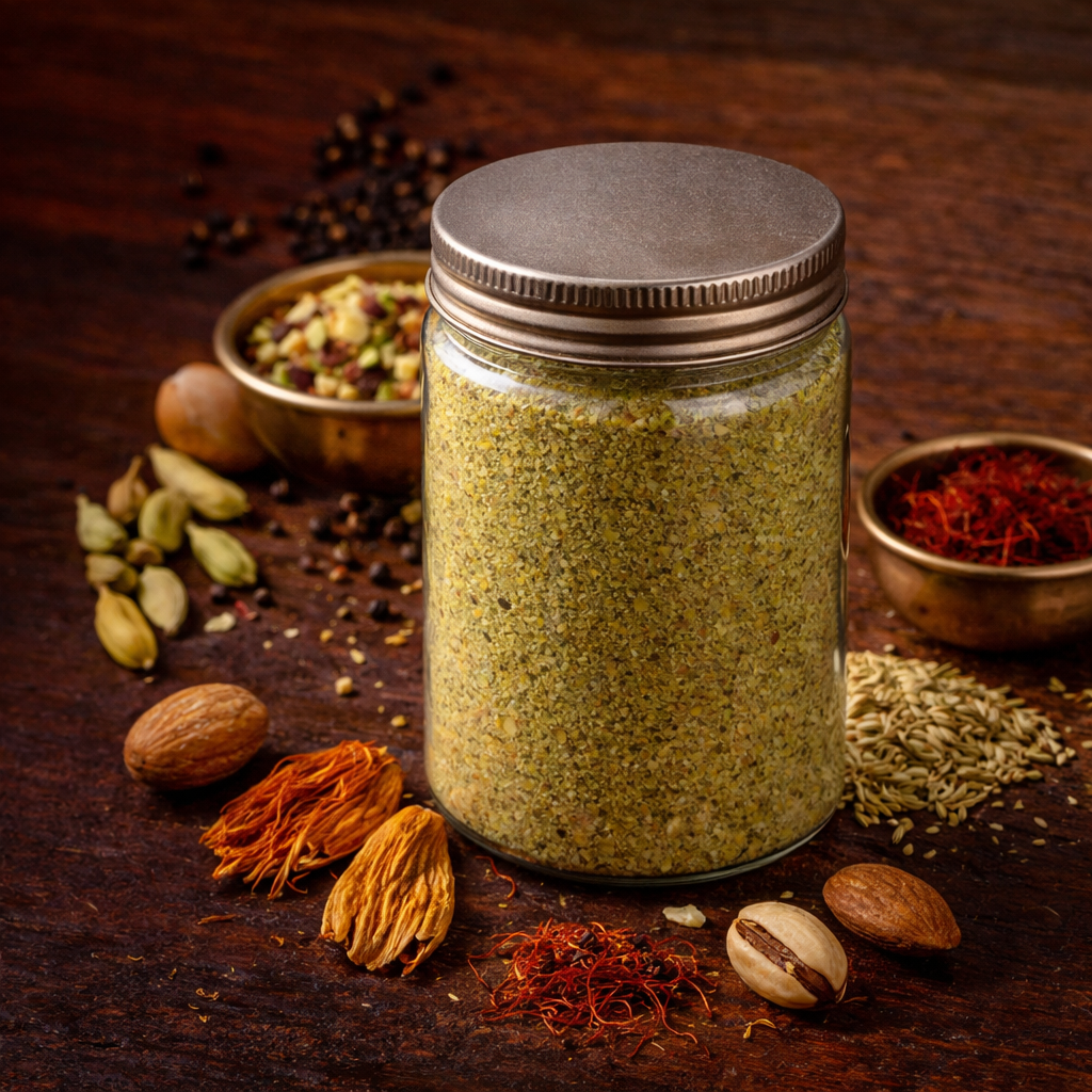 A rich blend of saffron, nuts, and aromatic spices crafted to enhance every cup of milk. Traditional taste with a warm, comforting aroma.